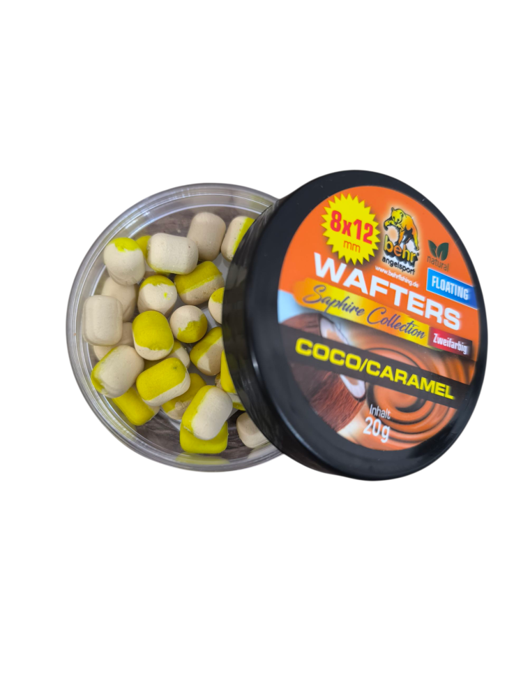 Изцяло новата гама стръв за куки Wafters от Behr. Дъмбелите се предлагат в различни вкусове и размери и са подходящи за всички видове едри риби. Те са плаващи и следователно се издигат над дъното, идеално имитирайки хранителното поведение на дънните риби. Само след няколко секунди във водата, дъмбелът освобождава неустоимия си аромат в нея. Консистенцията е много здрава, така че стръвта остава здраво залепена за монтажа, дори когато е захвърлена. Вкусовете и цветовете са перфектно съчетани от експертите на Behr и на практика гарантират успешен улов. Дъмбелите се предлагат в размери 4x6 мм опаковани в малки, практични кутии от по 20 грама всяка. Аромат: Кокос и карамел Размер: 8x12 мм Тегло на опаковката: 20 гр
